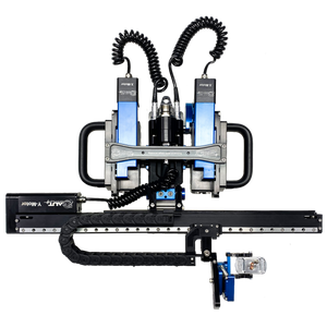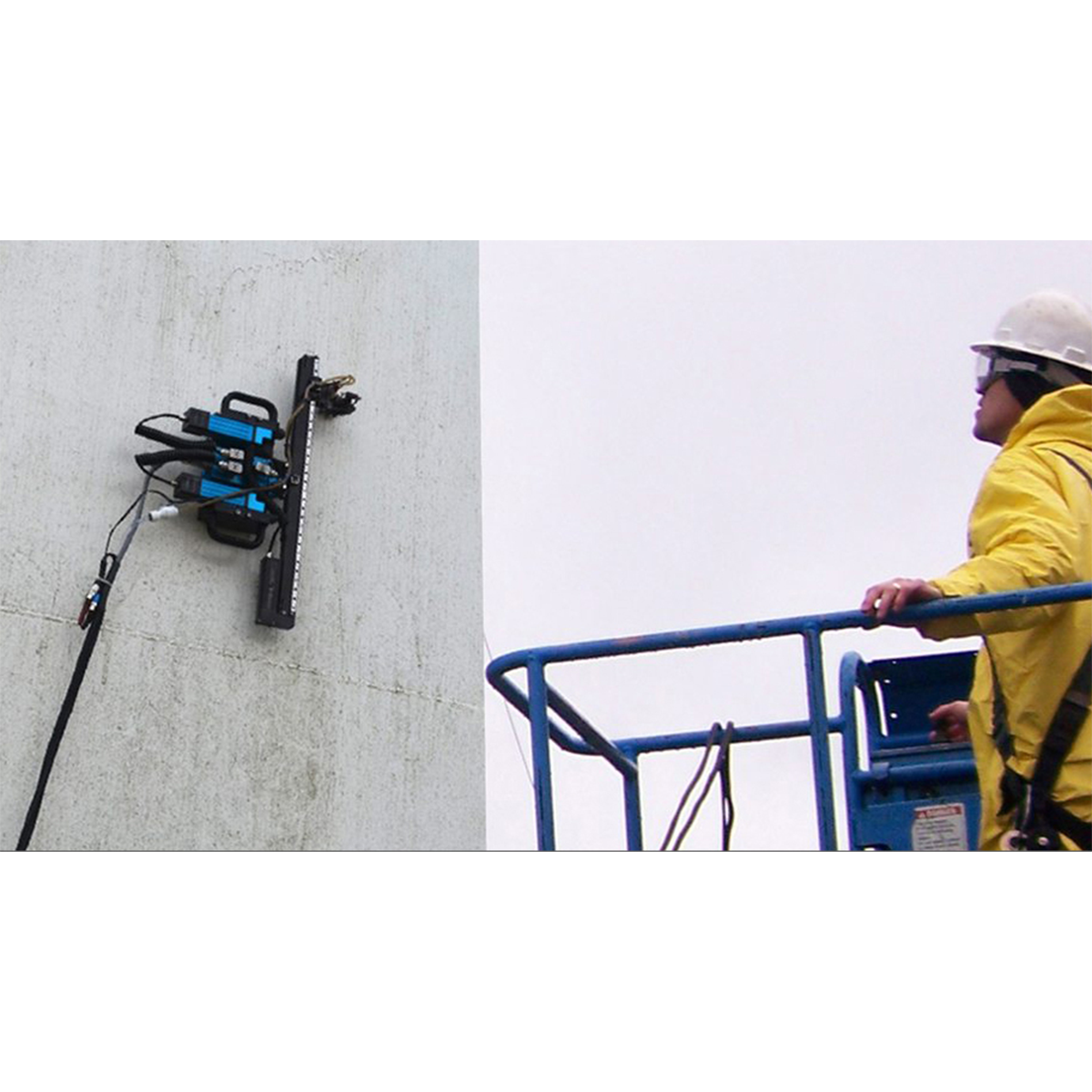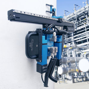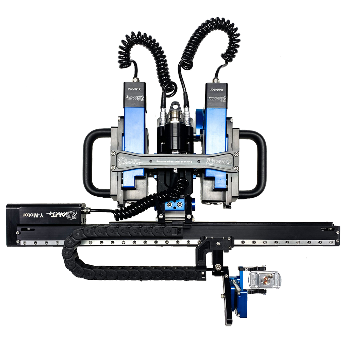 The AccuTrak truck assemblies rotate in multi-axis to allow near-perfect wheel contact to a flat or curved surface using its two powerful X-axis drive motors and magnetic wheels to help propel the scanner and umbilical vertically with little load, even when crossing over weld seam. The truck assembly can be locked into place for conventional 2-axis style scanning or unlocked to allow the scanner to become steerable on curved surfaces that are well suited for remote access corrosion mapping or weld inspection utilizing pulse echo, phased array, or TOFD technologies. AccuTrak is standard as a 3 axis scanner, but the 3-axis arm can be removed to perform simple line or weld scans. The AccuTrak can be provided with many options, such as multi-probe weld inspection, a battery-powered green laser line for weld tracking that can be visible in almost any light condition, and a camera for weld tracking purposes. The AccuTrak is also capable of performing automated weld tracking utilizing a patent-pending technology by AUT Solutions to track the scanner to the centerline of a weld automatically; thus, the use of heavy and awkward tracks is a thing of the past.