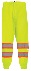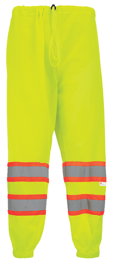 Safety pants, high-visibility yellow/green lightweight mesh polyester, 3M™ reflective material, elastic waist with adjustable drawstring, one back outside pocket, and side pocket access. ANSI class E.