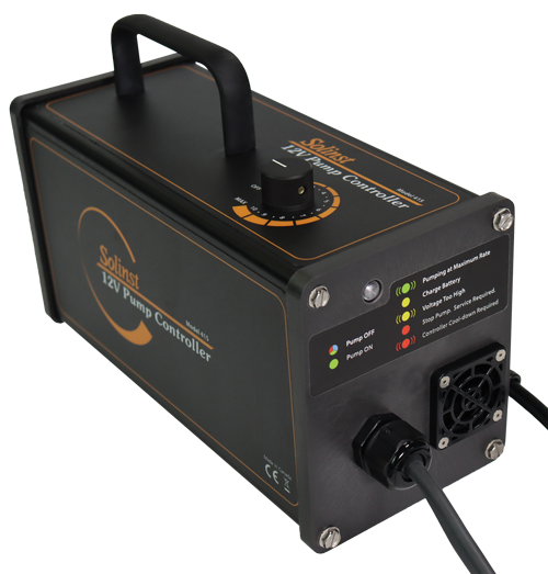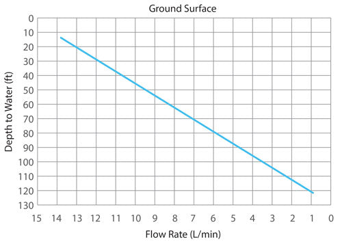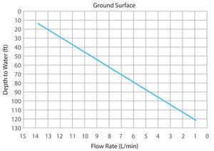 The Solinst 12V Submersible Pump is capable of pumping groundwater from 36.5 m (120 ft) below ground surface, with flow rates up to 13.5 L/min (3.6 US gpm) in shallow conditions.