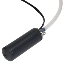 The Solinst 12V Submersible Pump system comprises the 12V Submersible Pump with cable, 12V Pump Controller, sample tubing (sold separately), and a user-supplied power source. The 12V Submersible Pump cable simply connects to the 12V Pump Controller, which then clips to a 12V power source (sourced separately). The 3/8" (9.5 mm) ID LDPE sample tubing is pushed onto the barbed fitting on the 12V Pump.